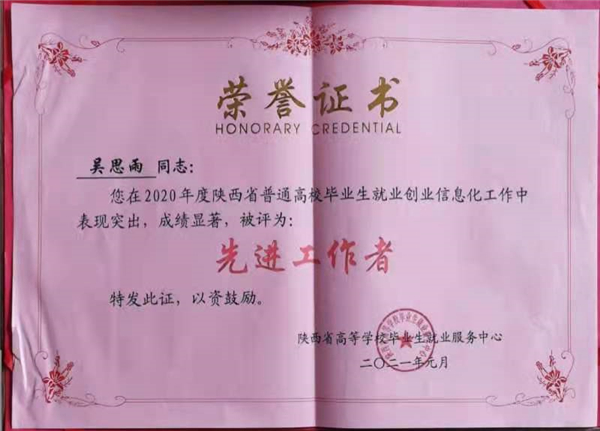 近日,陕西省教育厅对2020年度陕西高校就业创业信息化工作先进集体和个人进行通报表彰,我校吴思雨获评