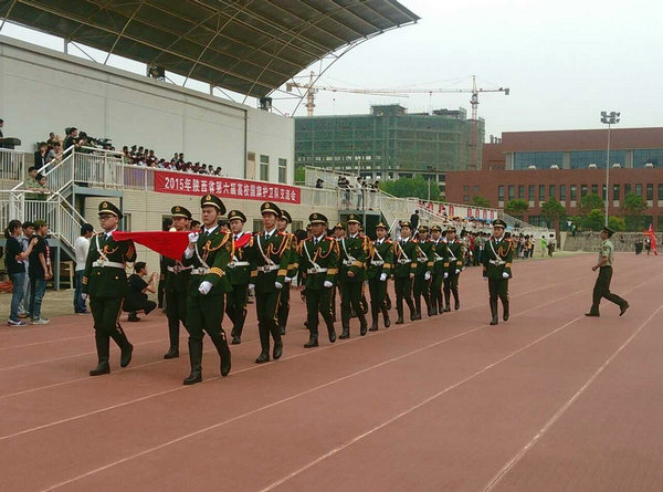 2015年5月17日,我院国旗护卫队应邀参加“陕西省第六届高校国旗护卫队交流会”, 围绕“同升一面旗