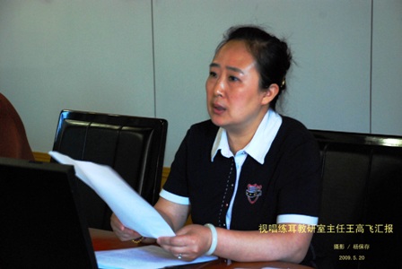 视唱练耳教研室主任王高飞汇报的题目是《以科学发展为指导、以教学团队为依托,努力提高教学质量》。她简要回顾了历史,分析归纳了存在的5点问题,提出了加强建设的6条措施,对视唱练耳未来发展作了全面思考并进行了定位。