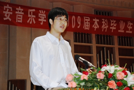 下午,院长赵季平,副书记、副院长孙卫国,副院长安金玉、罗艺峰出席了仪式。仪式由副院长安金玉主持,副院长罗艺峰教授宣读了《学士学位授予决定》,院长赵季平教授为作曲系、钢琴系、声乐系、民乐系和管弦系毕业生颁发了学位证书。毕业生代表戴杨、在校生代表刘洋分别作了发言,副书记、副院长孙卫国代表院领导讲话,向即将告别母校、走向社会的毕业生表示热烈的祝贺,并希望毕业生走出校门后要继续学习,努力工作,有所作为,为母校争光。