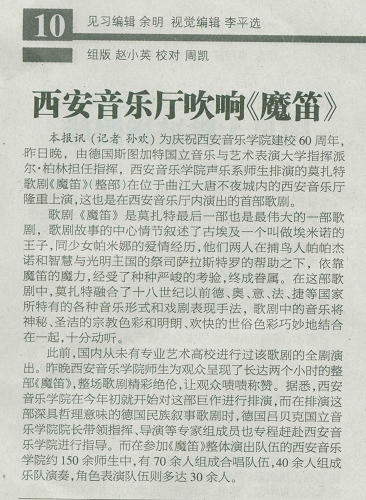 《西安晚报》2009年10月11日第10版 西安音乐厅吹响《魔笛》