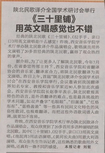 《华商报》2009年10月13日 B9 陕北民歌译介全国学术研讨会