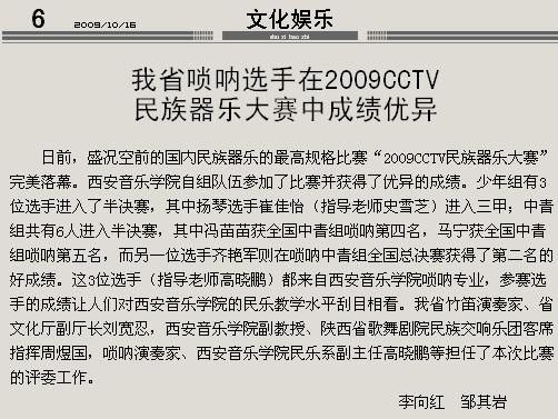 《陕西日报》2009年10月16日 第6版 我省唢呐选手在2009CCTV民族器乐大赛中成绩优异