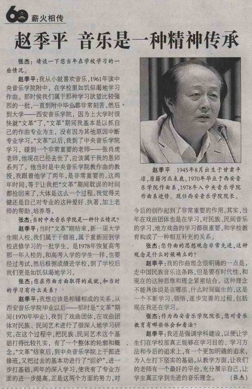 《中国教育报》2009年10月18日 第4版 赵季平 音乐是一种精神传承