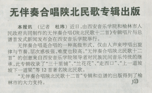 《陕西日报》2009年10月28日第4版 无伴奏合唱陕北民歌专辑出版