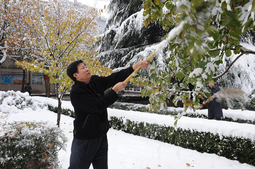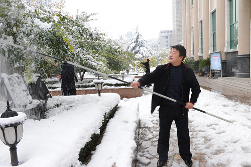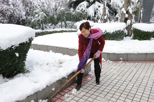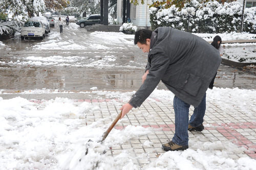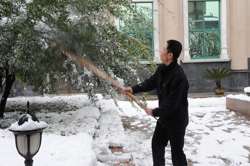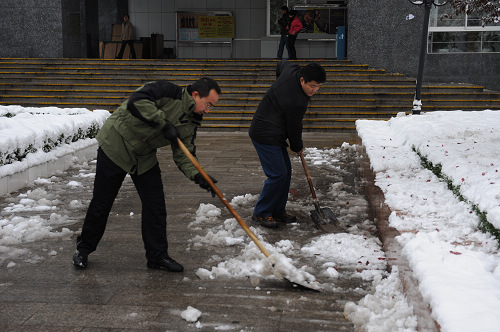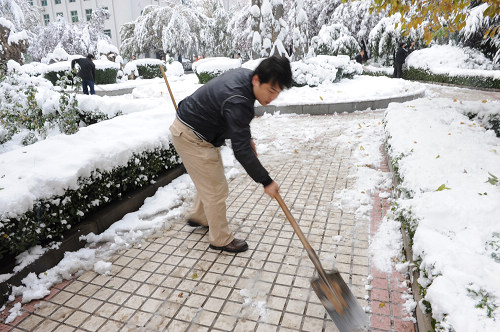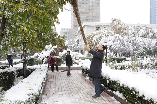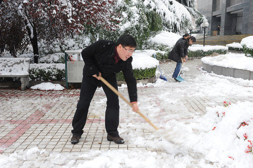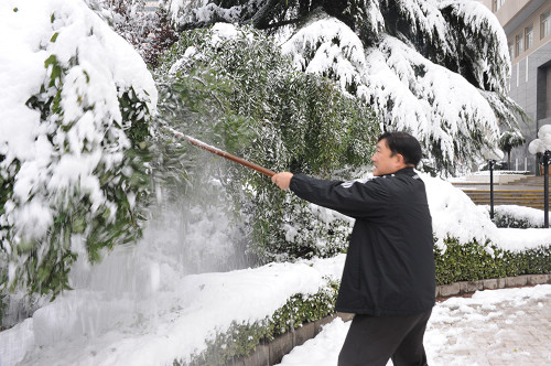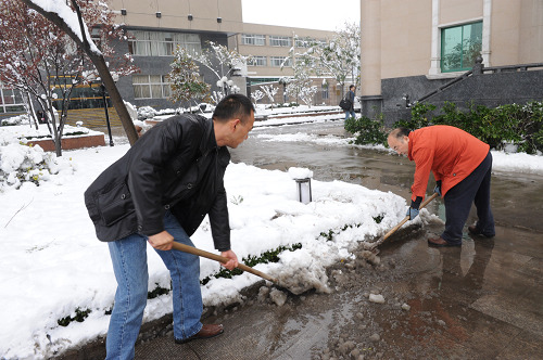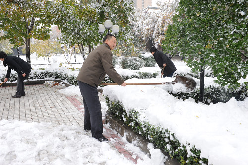 一场大雪覆盖了整个校园:道路打滑,树木被积雪覆盖。为保障师生职工行路安全,避免树木受损,11月12日一上班,院党委书记安宁、纪委书记史军胜就组织机关干部,开展了扫雪除冰清路活动。大家挥舞手中的铁锨、扫把、竹竿,清除道路和树枝上的积雪。尽管天气寒冷,大家却汗流浃背,干劲十足。经过两个小时的认真清理,主要人行道和树枝的积雪已扫去。此次扫雪活动,不仅为广大师生员工的工作、学习和生活创造了便利,防止了树木损坏,而且也彰显出机关干部的表率作用和为师生服务的精神。(宣)