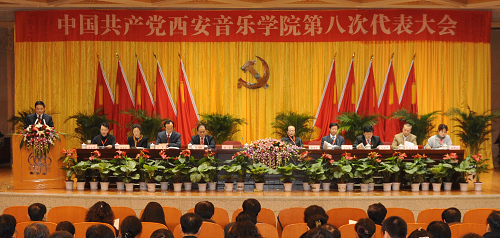 2009年12月6日上午9时,中共西安音乐学院第八次代表大会开幕式暨第一次全体代表会议在学术厅隆重举行。主席台上方悬挂着“中国共产党西安音乐学院第八次代表大会”的横幅,正中央悬挂着金色的党徽,10面鲜艳的五星红旗排列在党徽两旁,台上由绽放的鲜花装点,整个会场庄严肃穆、生气勃勃。这次大会应到正式代表共110名,列席代表13名。实际到会正式代表108人,符合法定开会人数。孙卫国同志主持会议。