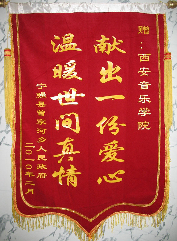 2010年2月26日,陕西宁强县曾家河乡人民政府向我院团委送来写有“献出一份爱心,温暖世间真情”的锦旗和感谢信,表达对我院团委组织团员青年开展“我们是熊宁——红围巾温暖行动”、向地震灾区人民无私捐赠过冬物资的感激之情。