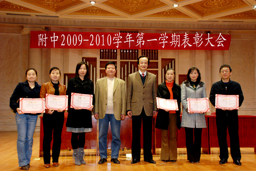 2010年3月24日下午4:00,附中召开了全校师生大会。对在2009-2010学年第一学期的工作学习中成绩优异的师生进行了表彰,对开学以来附中的各项工作进行了总结,并详细阐明了附中今后工作的思路和措施。附中全体师生以及部分学生家长参加了会议,纪委书记王平到会并向获奖教师颁奖。大会由附中书记韩莉主持。