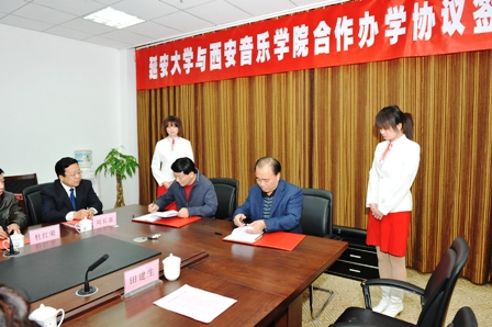 4月9日,我院党委书记安宁,党委副书记、副院长孙卫国带领党政办、组织部、干部人事处、学工部、教务处、科研处、团委负责人一行八人赴延安大学,参加两校合作办学签字仪式。下午三点,我院与延安大学合作办学签字仪式在延安大学图书馆二楼会议室隆重举行,延安大学副校长王延奇主持,副校长胡俊生宣读了《西安音乐学院与延安大学合作办学协议书》,我院党委副书记、副院长孙卫国和延安大学校长廉振民代表双方在《合作办学协议书》上签了字。最后,我院党委书记安宁和延安大学党委书记刘建德作了重要讲话。双方表示,珍惜两校的合作办学的机会,加深两校之间的友情,相互学习相互协作,认真履行好双方义务和职责,精心策划,共谋发展,达到双赢。