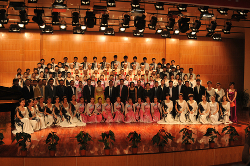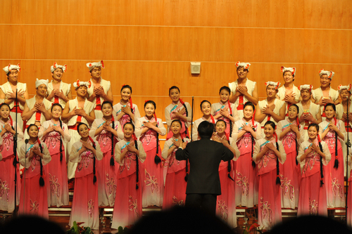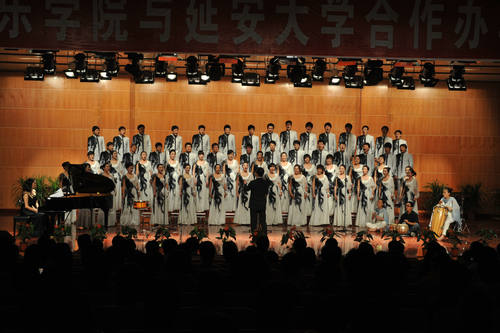 5月9日晚,在延安大学,我院合唱团与延安大学鲁艺合唱团联袂上演了一场主题为“五月欢歌”的音乐会。音乐会上,我院声乐系教师、著名女高音歌唱家鲜于越歌演唱了约翰·施特劳斯轻歌剧《蝙蝠》中的《笑之歌》。延安大学鲁艺学院张金星、张冰雁、王小珏,我院学生马腾、潘苏等先后献歌。两校合唱团分别演唱了近十首中外名曲。最后,两校合唱团共同演唱了陕北民歌经典曲目《山丹丹开花红艳艳》,把音乐会推向了高潮。音乐会既展示了声乐教育的专业水准,又充分彰显了原生态歌曲的韵味,为观众奉献了一场视听盛宴。此次音乐会也是落实两校合作办学的措施之一。延安市委市政府、延安干部学院部分领导,延安大学领导和我院党委书记安宁,副书记、副院长孙卫国,副院长白陆平等师生共500余人观看了音乐会。演出期间,观众中不时爆发出阵阵热烈掌声,获得一致好评。