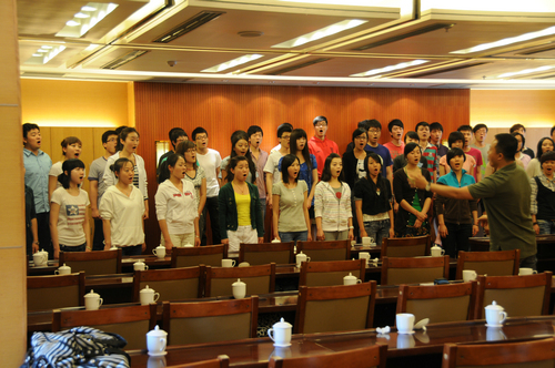 5月8日,在榆林群众艺术馆,合唱团师生聆听了馆长孟海平研究员和陕北民歌手雒胜军、王小怡关于陕北民歌的讲座及演唱。讲座、演唱精彩纷呈,生动实在,现场掌声不断。在榆林著名历史古迹、革命传统教育基地镇北台和红石峡,零距离的接触、激情四溢的演唱,使合唱团师生对陕北民歌独特的意味和魅力产生了更深的认识,完全沉浸在了歌声的意境之中。