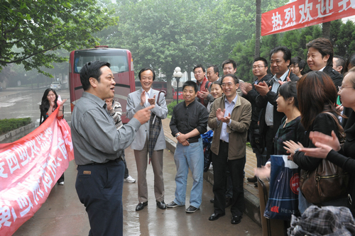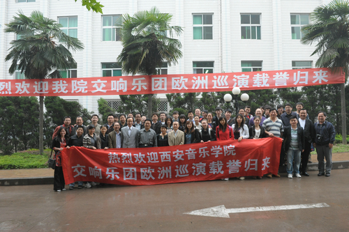 2010年5月13日19时左右,院党委书记安宁、纪委书记王平、副院长韩兰魁等领导及部分师生员工,冒雨在学院北大门迎接我院交响乐团欧洲演出归来。