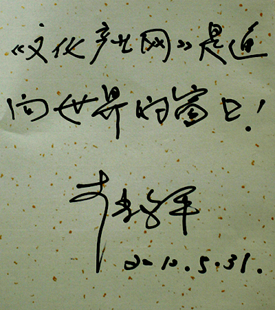 仪式结束,赵季平院长接受了媒体采访,他说,“陕西文化产业网就像是陕西通向世界的高速公路,是通向世界的窗口。希望陕西文化产业网紧紧围绕省委、省政府关于我省文化体制改革及文化产业发展的中心工作,随时关注我省及国内文化产业发展的动态”。赵院长并为陕西文化产业网题词,表达了对陕西文化产业发展的良好祝愿。