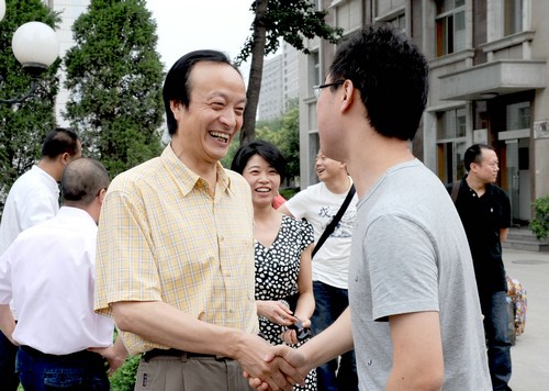 党委副书记、常务副院长孙卫国同志迎上前去,与声乐系主任、合唱团领队王真教授握手交谈