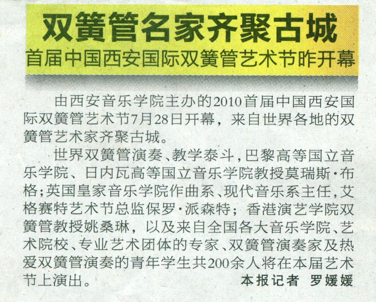2010年7月29日 《华商报》 B9版 双簧管名家齐聚古城——首届中国西安国际双簧管艺术节昨开幕