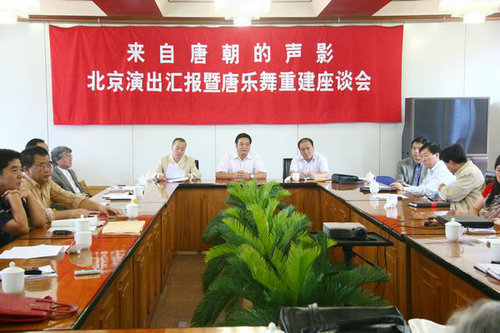 2010年8月27日上午,在西北民族音乐研究中心会议室,韩兰魁副院长主持召开了《来自唐朝的声影》北京演出汇报及唐乐舞重建座谈会。本次座谈会的中心议题是对暑假期间参加北京第29届世界音乐教育大会演出及研讨会进行回顾与深入讨论。院党委书记安宁、常务副院长孙卫国、纪委书记王平以及参与策划、演出、制作等部门的领导与教师参加了会议。