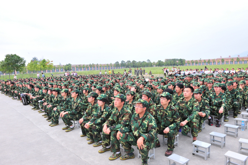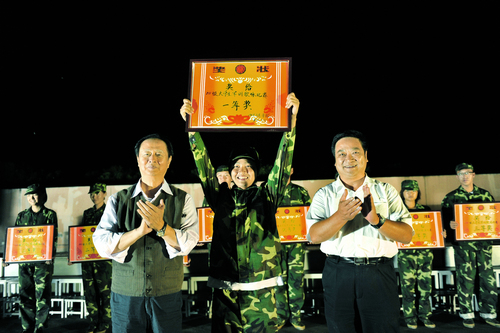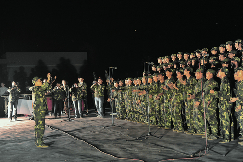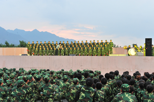 担任军训工作的领导与辅导员合唱《团结就是力量》领唱孙卫国(前排左三)