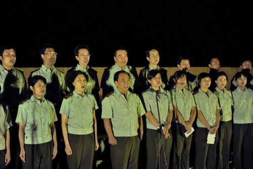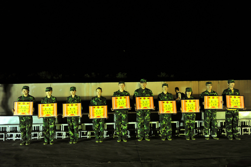 18:30时,开始观看我院军训团举行的歌咏比赛。参加军训的学生分成10个合唱队,参赛歌曲除规定的校歌《走进音乐》外,再自选歌曲一首。比赛现场秩序井然,同学们精神振奋,斗志昂扬,嘹亮的歌声划破寂静的夜空。最后,由我院参加军训工作的领导和辅导员为大家演唱了两首歌曲,博得了大家的热烈掌声。通过评委打分排名,最终音教三班荣获一等奖,音教四班和声乐系荣获二等奖,音教二班、民乐系、管弦系荣获三等奖,作理班、音教一班、钢琴系、舞蹈系荣获优秀奖。院党委书记安宁、院长赵季平上台亲自为获奖班级颁发了奖牌。