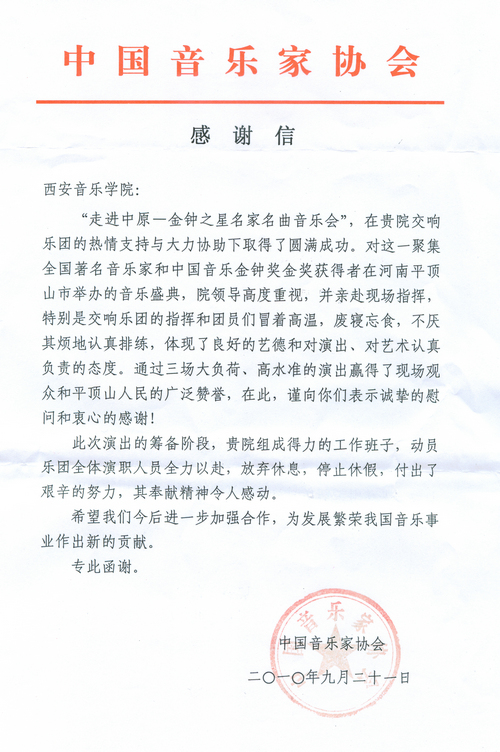 2010年9月16日至18日,在平顶山市会议中心,我院交响乐团应邀参加了“走进中原——‘金钟之星’名家名曲音乐会”演出。音乐会由中国音乐家协会、平顶山市委市政府共同主办,演出共分三天三场。出席音乐会的嘉宾有:全国政协副主席郑万通、国务院侨务办公室副主任任启亮、国务院发展研究中心副主任卢中原、全国政协教科文卫体委员会驻会副主任张秋俭以及河南省市各级领导。我院党委书记安宁,党委副书记、常务副院长孙卫国,党政办主任于金波也应邀出席。
