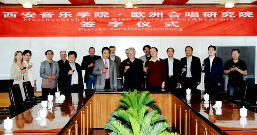 为了将合唱达到国际先进水平,促进中德音乐文化交流,我院与德国欧洲合唱研究院经过半年的努力,现双方合作条件已成熟,并于2010年10月5日上午,在培训学院举行了学术合作意向签字仪式。我院副院长白陆平主持仪式,院党委书记安宁与欧洲合唱研究院饶沙德·道斯先生分别致辞,院长赵季平与道斯先生分别代表双方在《中国西安音乐学院·德国欧洲合唱研究院学术合作意向书》上签字。