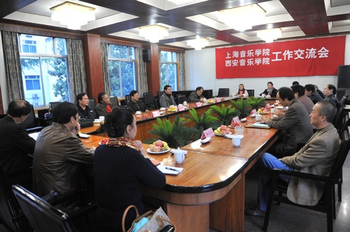 2010年10月26日下午,上海音乐学院、西安音乐学院工作交流会在我院培训二楼会议室举行。上海音乐学院常务副院长徐孟东,原院长杨立青,教务处长周湘林,作曲系党支部书记、副主任张旭儒,作曲家陆培出席交流会;我院党委书记安宁,院长赵季平,纪委书记王平,副院长白陆平、韩兰魁及教务处,科研研究生处、作曲系和宣传部负责人参加了工作交流会。