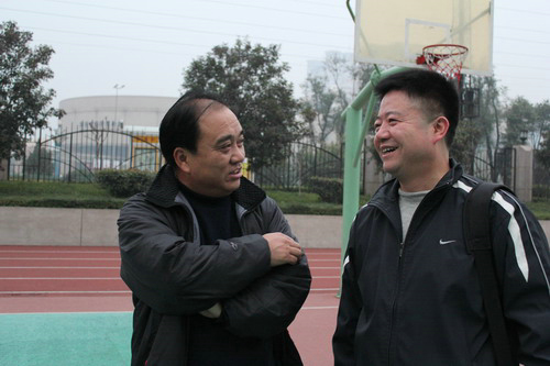 附中校长唐灵宝(右)向党委副书记、常务副院长孙卫国汇报早操情况