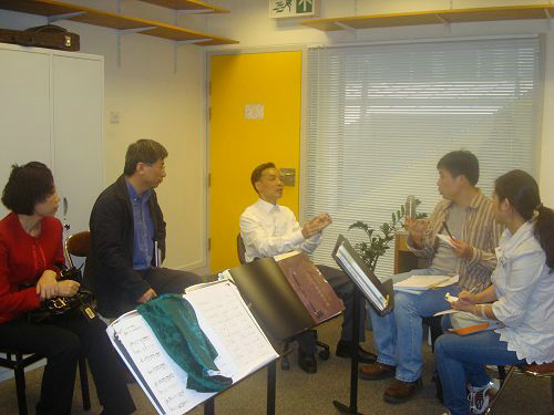 与香港演艺学院白得云博士(左二)、余其伟教授(左三)讨论课程安排