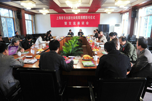 2010年11月11日上午,“上海音乐出版社向我院捐赠图书仪式暨合作交流座谈会” 在培院二楼会议室举行。上海音乐出版社社长费维耀、副社长叶建初、上海文艺音像电子出版社副总编刘丽娟、上海音乐出版社编辑部主任朱凌云、市场部主任周洲等出席了捐赠仪式和座谈会;我院院长赵季平、纪委书记王平、副院长白陆平、副院长韩兰魁以及教务处、科研与研究生处、西北民研中心、宣传部与各系负责人等参加了本次活动。