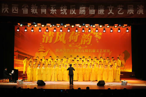 晚会上,由我院报送的原创合唱作品《宝塔清风赞》(陈晓涛词、王平曲)《廉洁颂》(张茜词、龚佩燕曲、李强指挥、潘苏领唱、牛滨、范文彦伴奏)拉开了整场晚会的序幕。刚刚从国家大剧院载誉归来的音乐教育系百人合唱团声情并茂,气势恢弘,充分展现了全省教育系统广大师生、纪检监察干部勇于进取,奋发向上的精神风貌。我院舞蹈系倾情献上的《清风荷韵》(编导:李颖、韩静)、《花儿为什么这样红》(编导:李颖、曹慧君)从不同的角度给观众带来了难得的视听享受。整台晚会突出反腐倡廉主题,弘扬正气,鞭挞腐败,内容积极向上,格调高雅,催人奋进,发人深思。