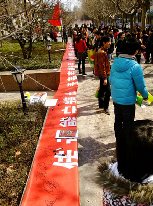 为继续弘扬“奉献·友爱·互助·进步”的志愿精神,增强当代大学生志愿服务理念,我院学生会于2011年3月3日开展了以“传承熊宁精神﹑青春奉献世园﹑倡树文明新风—青年志愿者在行动”为主题的志愿活动。活动的主要内容包括“倡导文明风尚﹑保护环境”志愿者签名及宣传世园会知识。