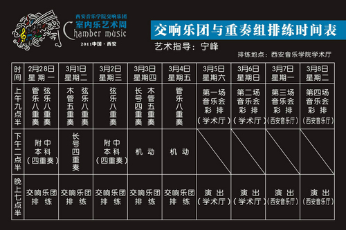 2011年2月28日,我院交响乐团举办的室内乐艺术周拉开帷幕。经过几天的排练,3月5日、6日晚将在我院学术厅举行音乐会,7日和8日晚在西安音乐厅演出。
