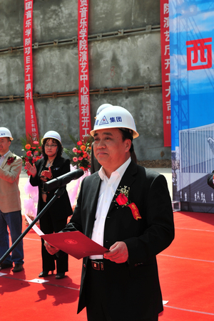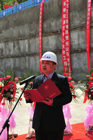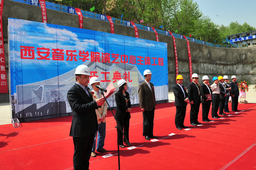 陕西建工集团总公司总经理李里丁讲话,高度评价了演艺中心从设计构思到工程的科技含量都是一流的,并表示要把演艺中心建设作为陕西建工集团总公司的重点工程来抓,调集精兵强将,创建一流精品工程。同时,要求参建队伍要做到标准化施工,从点滴抓起,所有工序都要达到国颁标准;绿色无污染施工,节能减排、低碳高效,要把工地建成绿色低碳化施工的典范;做到和谐施工,使演艺中心建设成为陕西建工集团总公司一个新的亮点工程。