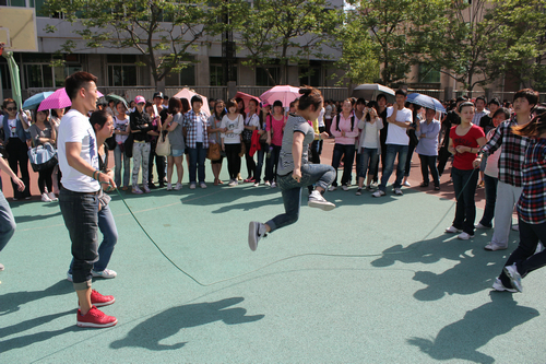4月23日下午,我院大学生春季“跳绳”趣味运动比赛在学院操场举行。以跳大绳为主,限时4分钟,成绩最高者为优胜。比赛以团支部为单位组队,共有31支队伍,分9组参赛。比赛结果,音乐教育系2008级(3)班获得第一名,音乐教育系2008级(1)班获得第二名,管弦系2010级获得第三名。