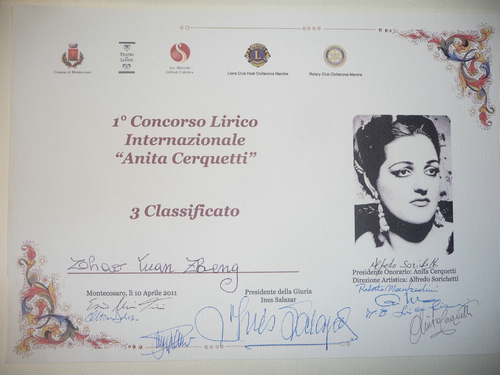第一届ANITA CERQUETTI国际声乐比赛第三名