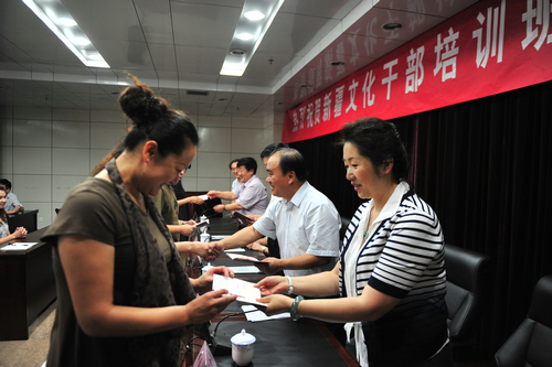 2011年6月15日上午,新疆文化干部培训班结业典礼在5号教学楼二楼会议室举行。院党委书记安宁,党委副书记、常务副院长孙卫国,副院长白陆平、安金玉,新疆文化厅人事处阿不拉江·艾沙副处长、努尔比亚·吐尔地科长,有关部门负责人和专业教师、培训班学员参加结业典礼。典礼由党政办公室主任于金波主持。