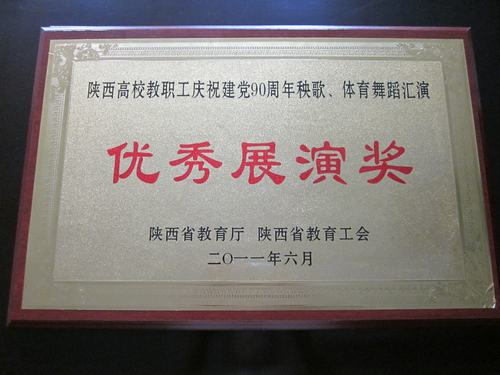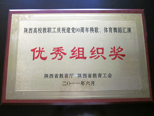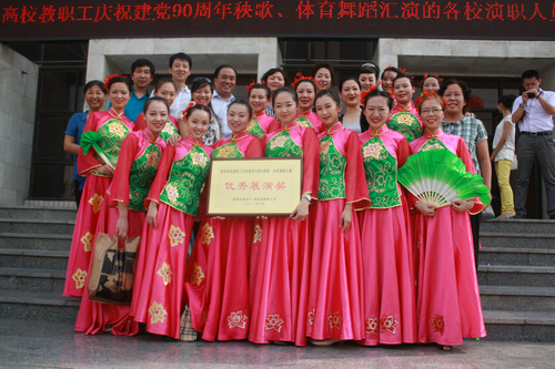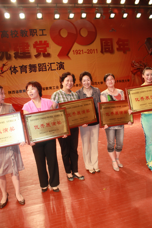 为隆重庆祝中国共产党成立90周年,全面展示陕西高校教职员工奋发进取、昂扬向上的精神风貌,激发和凝聚广大教职工爱党爱国爱校热情,团结和号召广大教职员工坚定信念、振奋精神、鼓足干劲,投身党的教育事业,6月13日、14日,由陕西省教育厅、省教育工会举办的“陕西省高校教职工庆祝建党90周年秧歌、体育舞蹈汇演”在西安电子科技大学隆重举行。我院党委副书记 、常务副院长孙卫国,副院长、工会主席安金玉亲临演出现场为教职工鼓劲、加油,并和其他高校领导一起观看了演出。最终,由我院工会组织选送的自编歌舞秧歌《米脂婆姨》获最高奖项“优秀展演奖”,院工会获“优秀组织奖”。