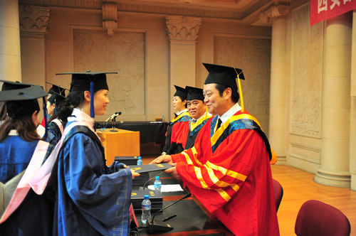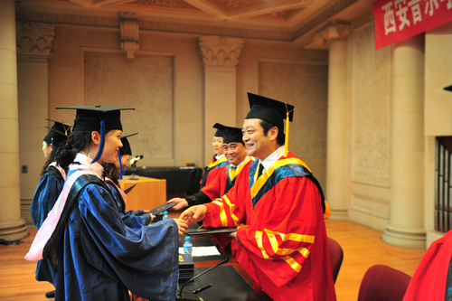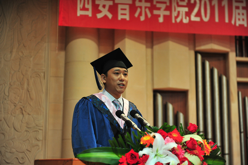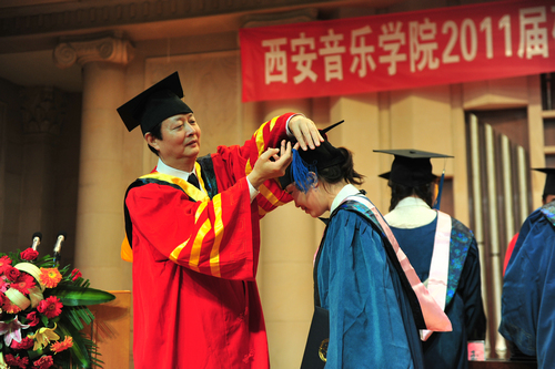 最后,同学们从院领导手中接过学位证书,由院长赵季平为大家一一正冠扶苏,合影留念。在熟悉的《西安音乐院校歌》声中,同学们纷纷用美丽的鲜花向领导和导师表达着心中的感谢,开始新的人生旅程。