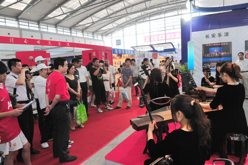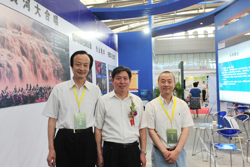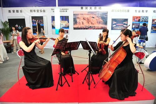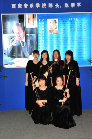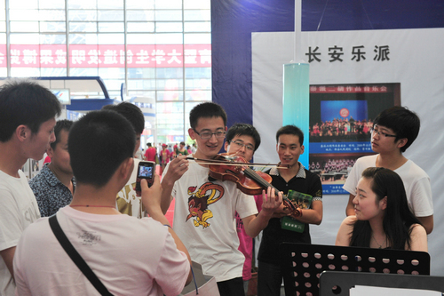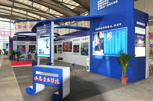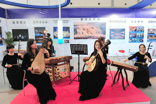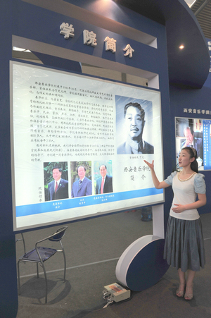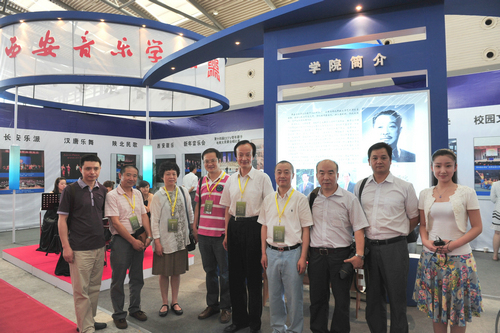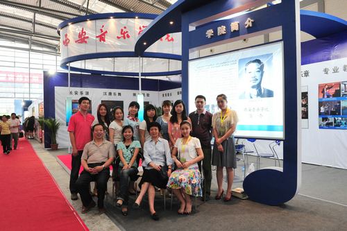 走进博览会B3展馆,西安音乐学院6个大字赫然醒目于众多院校标准展位上方。首任校长贺龙元帅照片及学院简介以音乐符号的板型矗立在展位中部,使众多参观者了解到我们西音是一所具有红色历史和文化传统的院校。赵季平院长的大幅照片和取得的成就在灯光的映照下熠熠生辉,西音的音乐文化高度一目了然。演奏台上弦乐四重奏和民乐丝弦演奏的美妙乐音,学生们的娴熟技巧和音乐气质使参观者驻足不前。背景墙上醒目的展板集中体现出我院办学特色和近年取得的成绩——汉唐音乐舞蹈、西安鼓乐、陕北民歌、秦派二胡古筝的教学演出照吸引着观众的眼球;新年音乐会、绿色呼唤音乐会、黄河瀑布前大型音乐会使人产生震撼感;一对一的教学方式和校园文化生活展板或许在消解着兄弟院校和社会人士对音乐院校的神秘感。走廊上“永远跟党走”的主题演出照气势宏大,使过往者惊叹不已。
