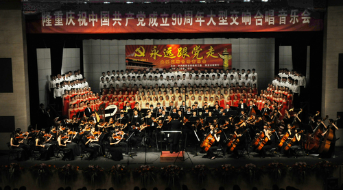 2011年6月28日晚,我院400名精神抖擞、神采飞扬、朝气蓬勃的演员齐聚人民剧院。剧院舞台前鲜花簇拥,满座的观众翘首以待,上下楼座间悬挂着“伟大的光荣的正确的中国共产党万岁”。随着一曲气势恢宏的交响乐《红旗颂》响起,“永远跟党走--隆重庆祝中国共产党成立90周年大型交响合唱音乐会”拉开帷幕。