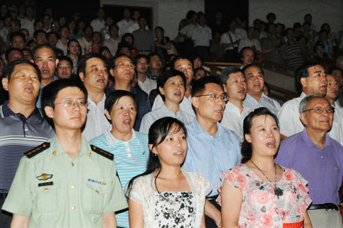 领导、演员与观众齐声高唱《没有共产党就没有新中国》