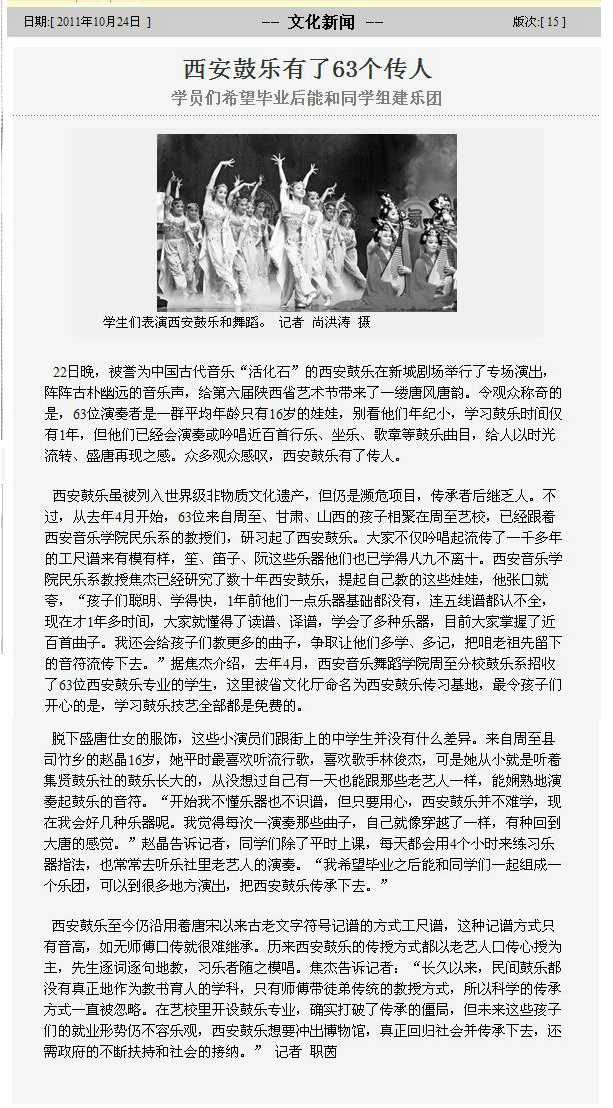 《西安晚报》2011年10月24日 13版 西安鼓乐有了63个传人