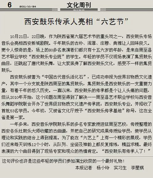 《陕西日报》2011年10月24日 6版 西安鼓乐传承人亮相:“六艺节”