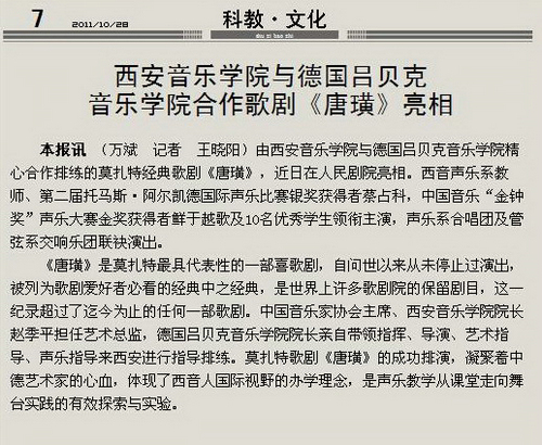 《陕西日报》2011年10月28日第7版 西安音乐学院与德国吕贝克音乐学院合作歌剧《唐璜》亮相
