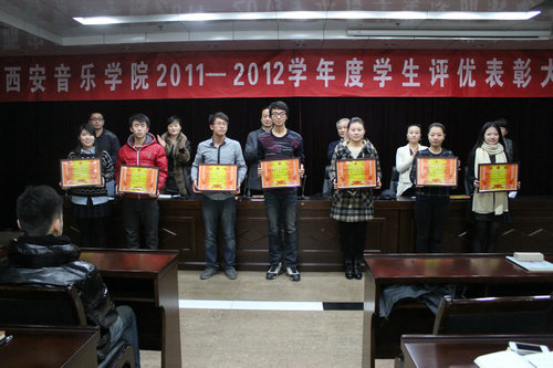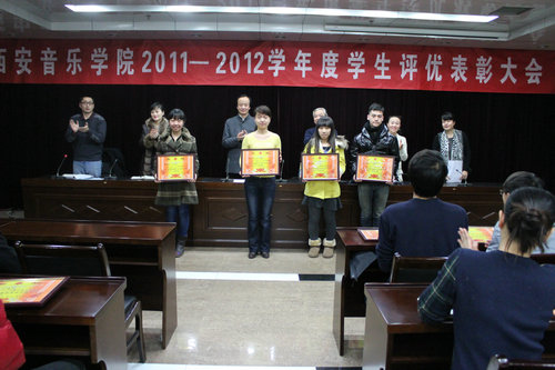 学工部部长张鉴宣读了《关于表彰2011—2012学年度优秀学生、优秀学生干部、先进班级体及奖学金获得者的决定》,与会领导为获奖班集体颁发了奖状。音教系09级3班学生谭洋洋作为获奖代表发言。