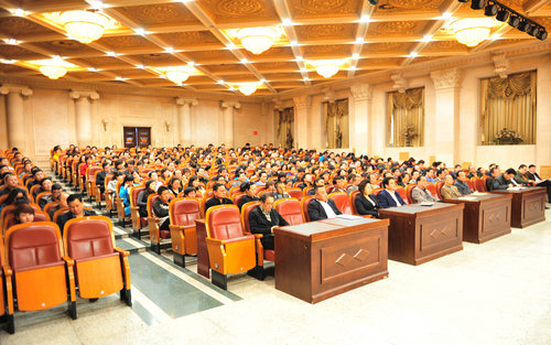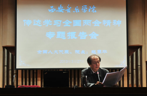 2013年3月27日下午,学院召开全院教职工大会,全国人大代表、院长赵季平传达十二届全国人大一次会议精神。会议由党委书记安宁主持。