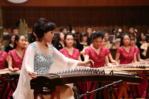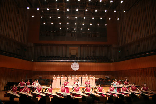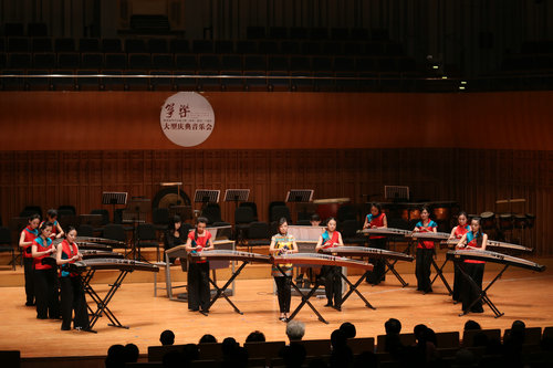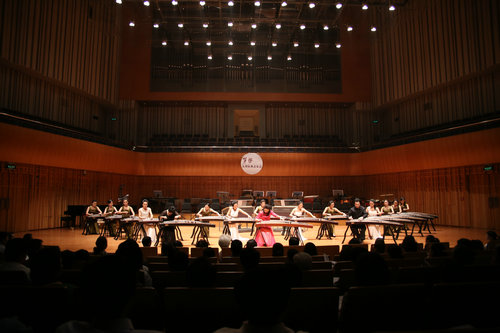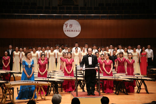 筝三重奏《倾杯情》拉开了庆典音乐会的序幕,筝与打击乐《大漠行》,双筝与萧《满庭芳》,筝齐奏《悦》,筝与室内乐《云裳诉》,筝弹唱《渔舟唱晚》,筝与打击乐《清风·舞乐》,筝协奏《望秦川》,筝与合唱《东渡》,筝与乐队《敦煌唐人舞》先后登台演出。时而空灵寂静,时而气势恢宏,演员们的倾情演绎把观众带入了对音乐的享受与思考之中。陕西筝派领军人周延甲,著名作曲家、指挥家何占豪,鲁日融教授,魏军教授,周煜国教授在主持人的介绍下与观众见面,音乐厅不时爆发出雷霆般的掌声。庆典音乐会在观众意犹未尽的思绪中落下帷幕。