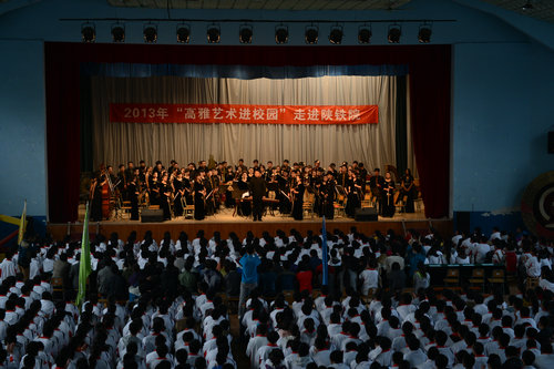 高雅艺术进校园活动得到了学院的高度重视。2013年10月23、24、25日,我院民族管弦乐团分别走进西安高新第一中学、西安高新逸翠园学校和陕西省铁路工程职业技术学院。曲目包括《庆典序曲》、《红楼梦组曲》、《大宅门组曲》卢沟晓月、《黄土地——石板腰鼓》、《长安社火》、《射雕英雄传》及《赛马》等。指挥:高伟。为活跃艺术氛围,还准备了原生态演唱,并进行现场导聆和讲解。