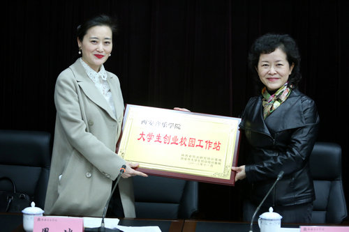 周冰宣读了西安音乐学院大学生创业校园工作站文件,王妮娜为我院大学生创业校园工作站授牌。