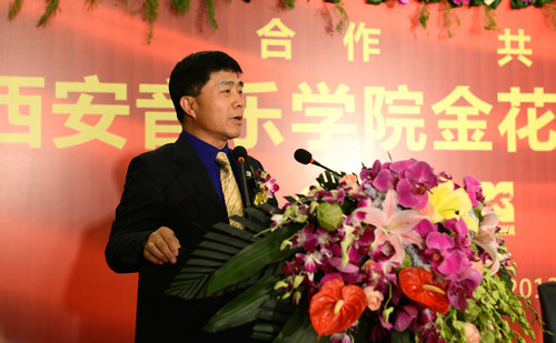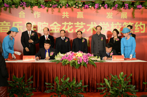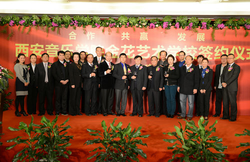 2013年11月14日晚,“西安音乐学院金花艺术培训学校” 签约仪式在金花豪生会议室举行。我院党委书记李映方、金花投资控股集团总裁吴一坚讲话并在合作办学合同书上签字。我院党委副书记、常务副院长孙卫国,纪委书记王平,副院长安金玉;金花投资控股集团党委书记、常务副总裁孙圣明,金花投资控股集团副总裁、世纪金花股份公司总裁曲家琪等出席并见证了签约。